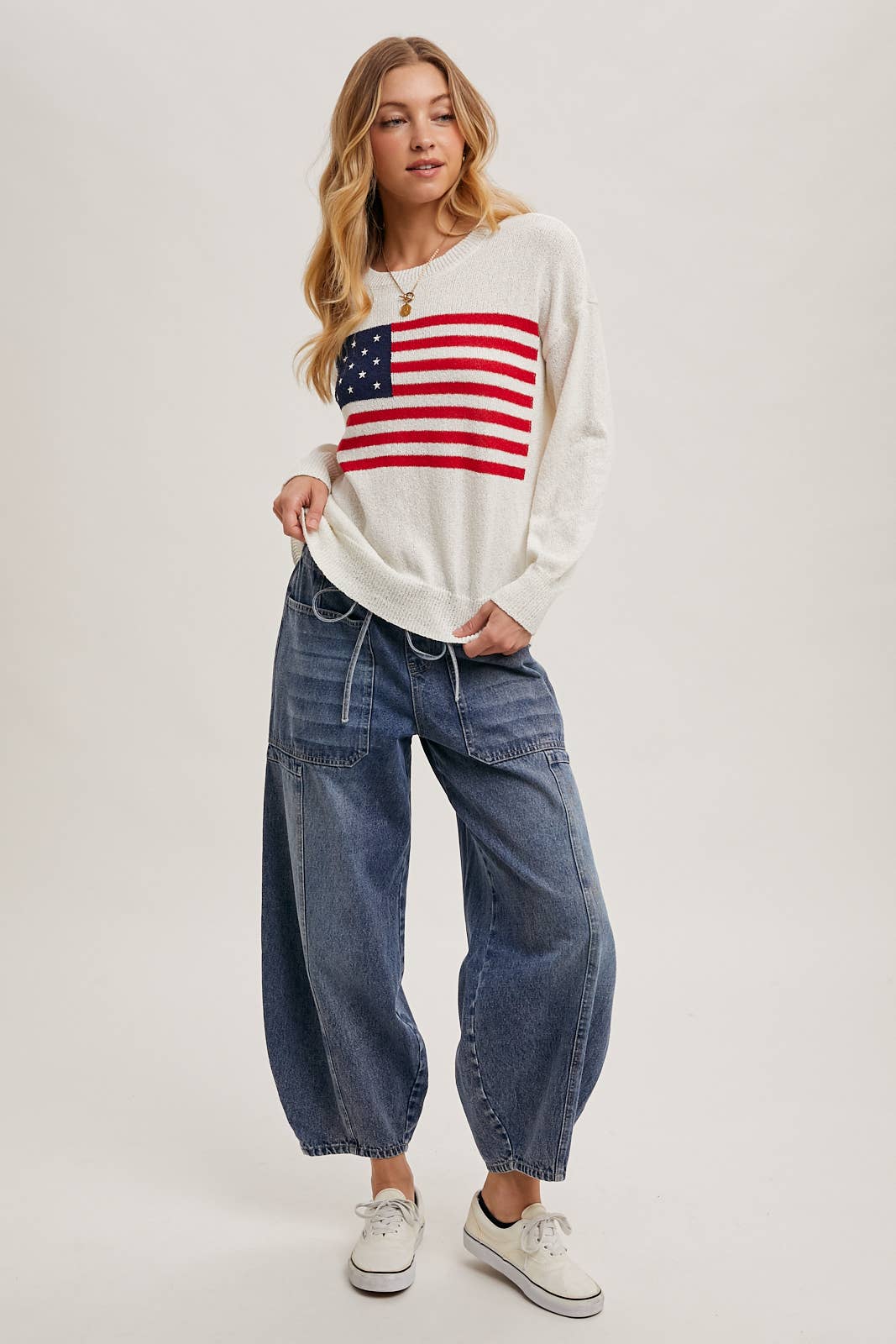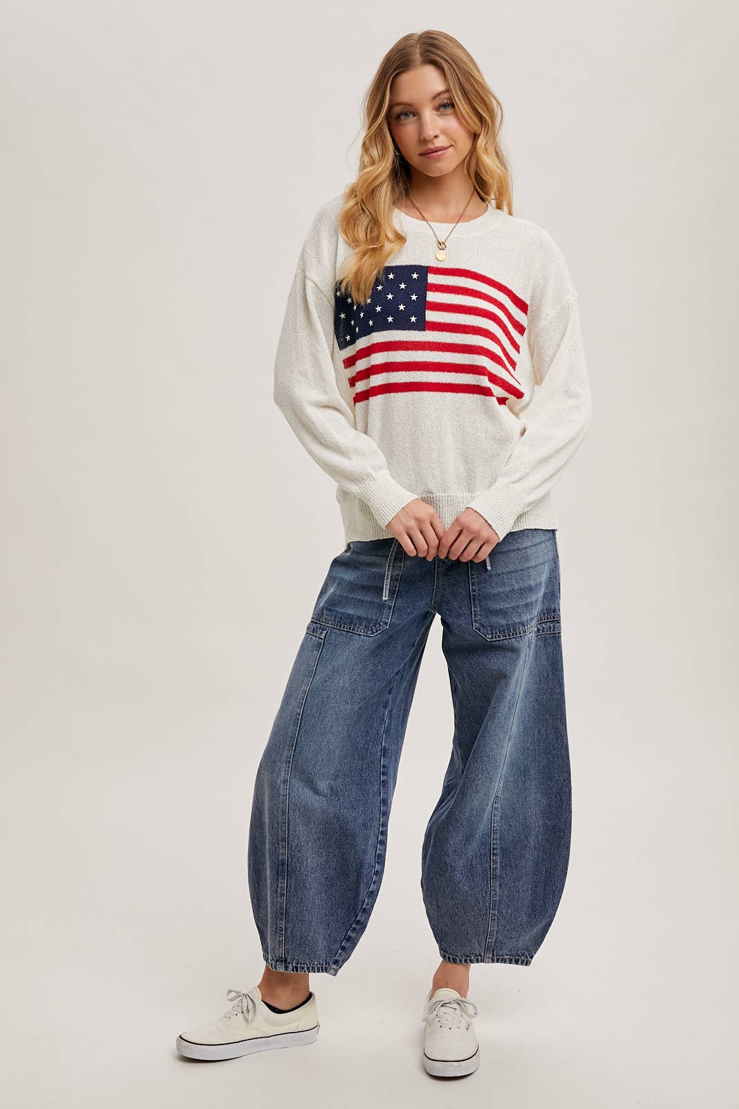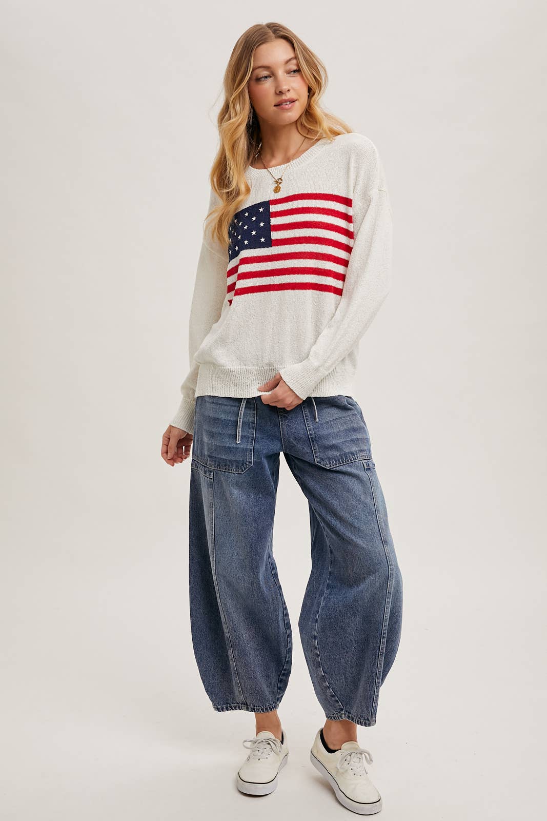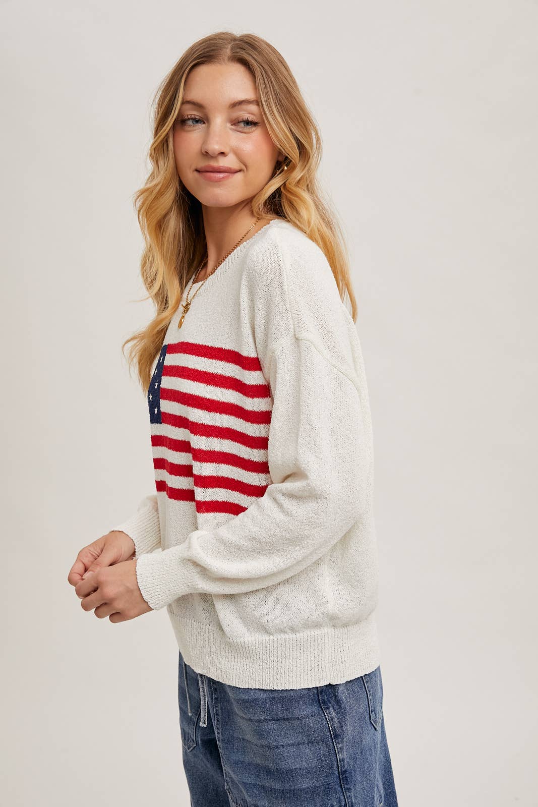 Show your patriotic spirit in style with this cozy American Flag Sweater Pullover. Featuring a bold flag design on a soft ivory knit, this piece pairs comfort with statement-making charm. The classic crew neck and ribbed trim provide a timeless fit that’s perfect for Fourth of July gatherings or year-round Americana vibes.