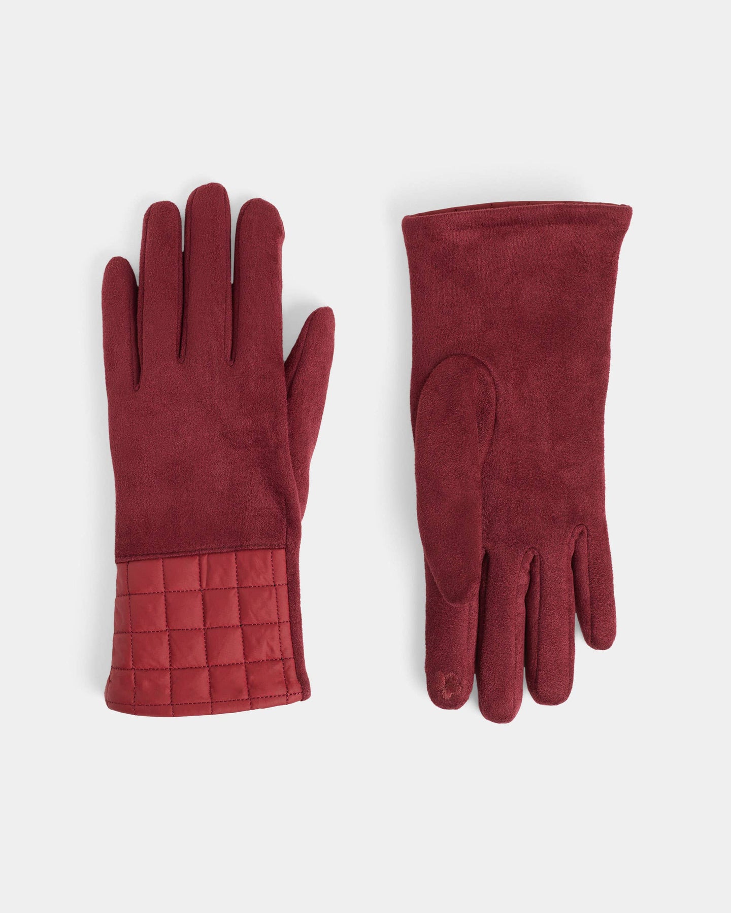 These red suede-textured puffer gloves deliver standout style with everyday warmth. Touchscreen functionality keeps your devices easy to use, while the padded wrist design adds a modern, cozy finish.